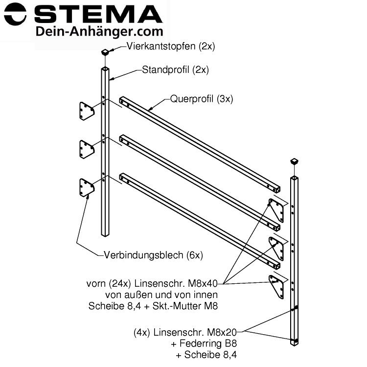 Die Montage erfolgt in die vorderen Kastenecken vom Anhänger. Im Lieferumfang sind die passenden Normteile enthalten.