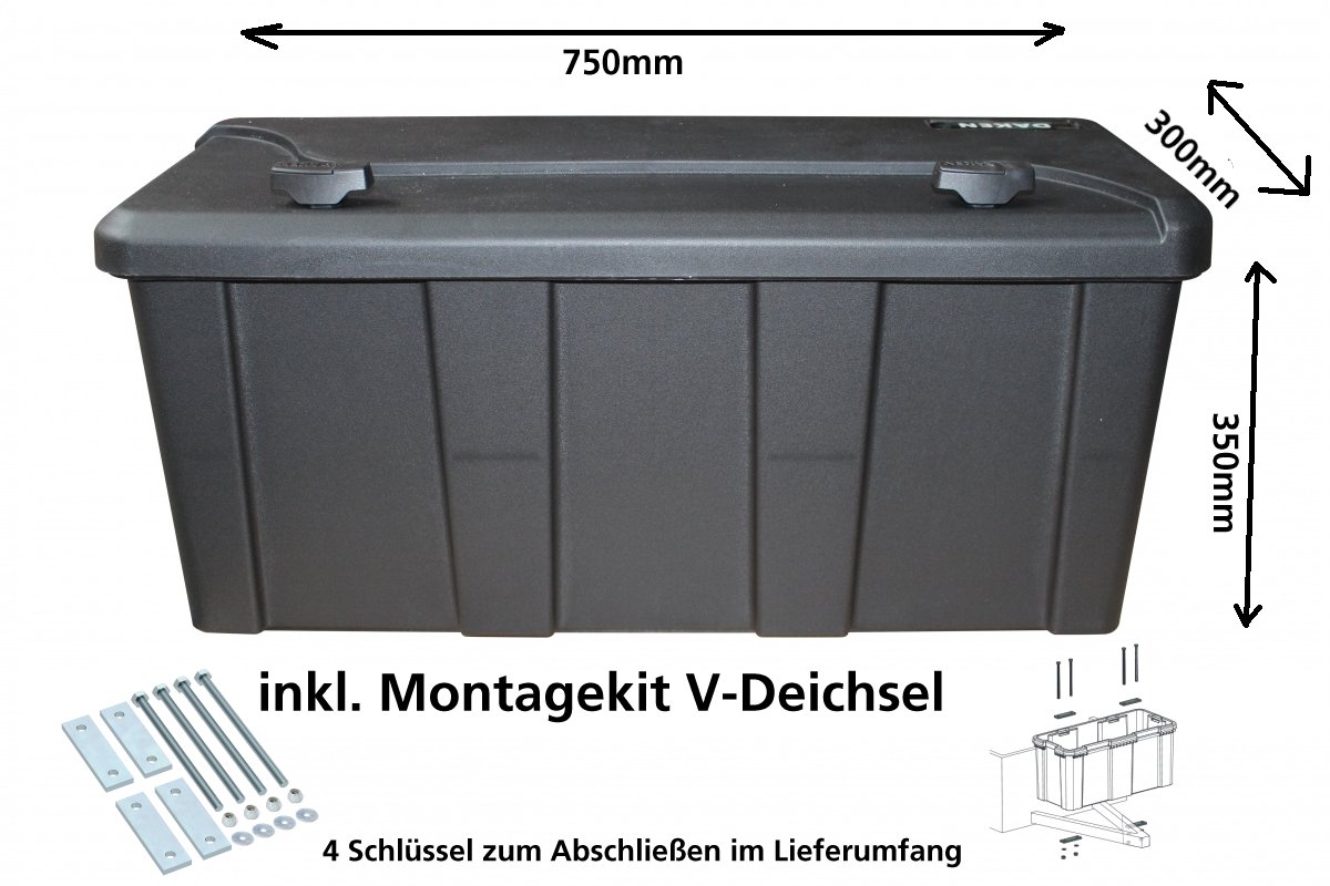 Blackit L, Deichselbox mit Schloss, 750x300x350 LxBxH Werkzeugkasten, Gurtkiste, Just Daken B50-2 inkl. Montagekit
